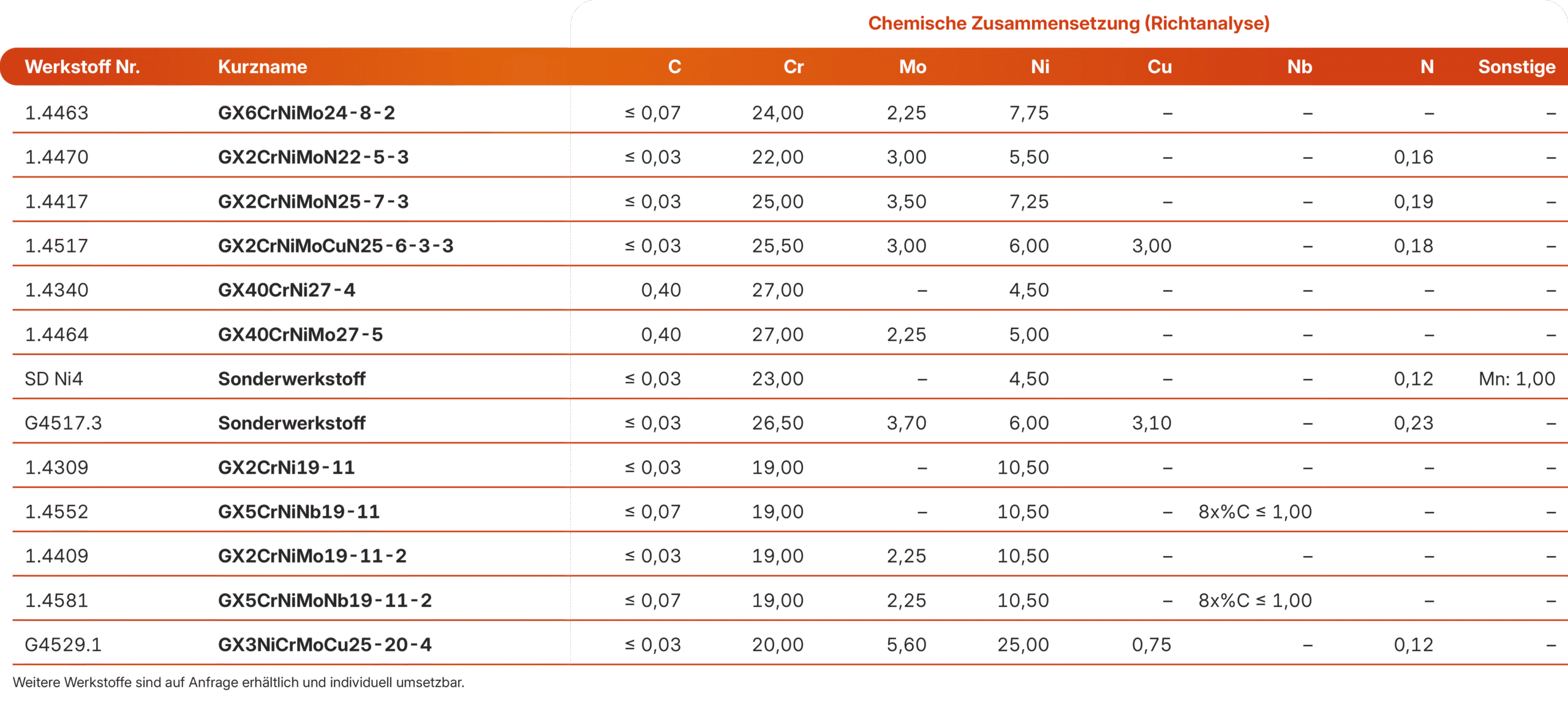 Nichtrostende Stahlgusssorten sind in DIN EN 10213, DIN EN 10283 und SEW 410 genormt. Die Bergischen Edelstahlwerken liefern aber nicht nur Standards, sondern auch Sonderanfertigungen und innovative Weiterentwicklungen. Das Highlight dieser Stähle ist die außergewöhnliche Beständigkeit gegen Rost und Säuren.